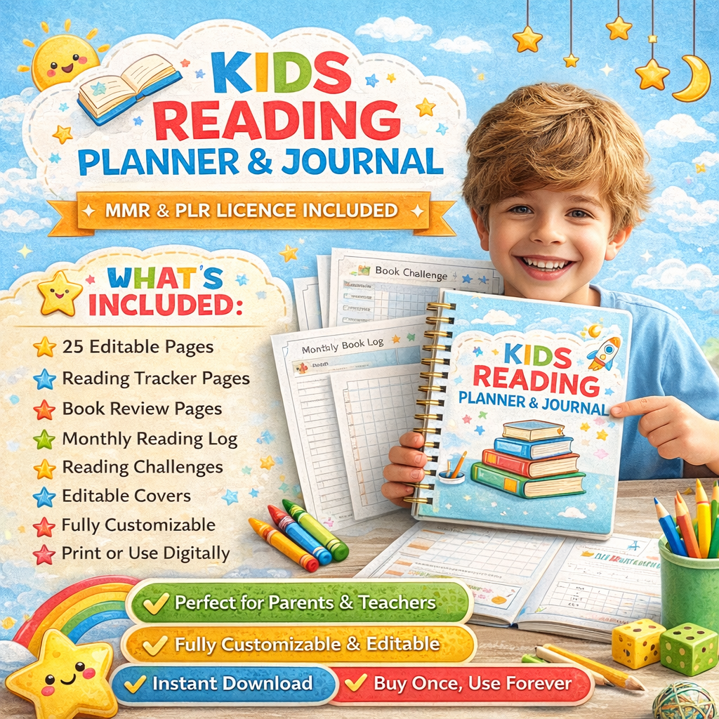 Help children build strong reading habits while offering a ready-to-sell digital product you can brand as your own. The Kids Reading Planner & Journal Bundle is a complete, done-for-you package designed for parents, teachers, and digital sellers who want a beautiful, customizable reading tracker for kids — plus the ability to resell it and keep 100% of the profits.